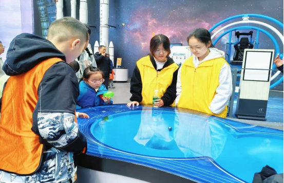 活动首站来到了以“问天、问水、问未来”为主题的一楼展厅。在航空航天厅,青少年学习到了航空航天和天文领域的基础知识,通过参观各种航天模型,青少年了解到人类探索太空的历程和近代我国在航天事业的辉煌成就;在都江堰水利工程展厅,鱼嘴、飞沙堰、宝瓶口,方寸之间,便可一窥都江堰治水之神奇,青少年纷纷惊叹古人治水的大智慧;在未来科技展厅,青少年通过游戏体验和职业体验感知充满人工智能和虚拟现实的未来世界。